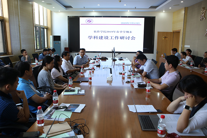 党委书记王斌主持会议会议的主要内容是讨论软件工程学科建设工作,为第五轮学科评估工作做准备。学院四个研究所的代表教师雍俊海、龙明盛、杨铮等分别介绍了各所目前的教学、科研、社会服务等情况和学科评估准备工作。