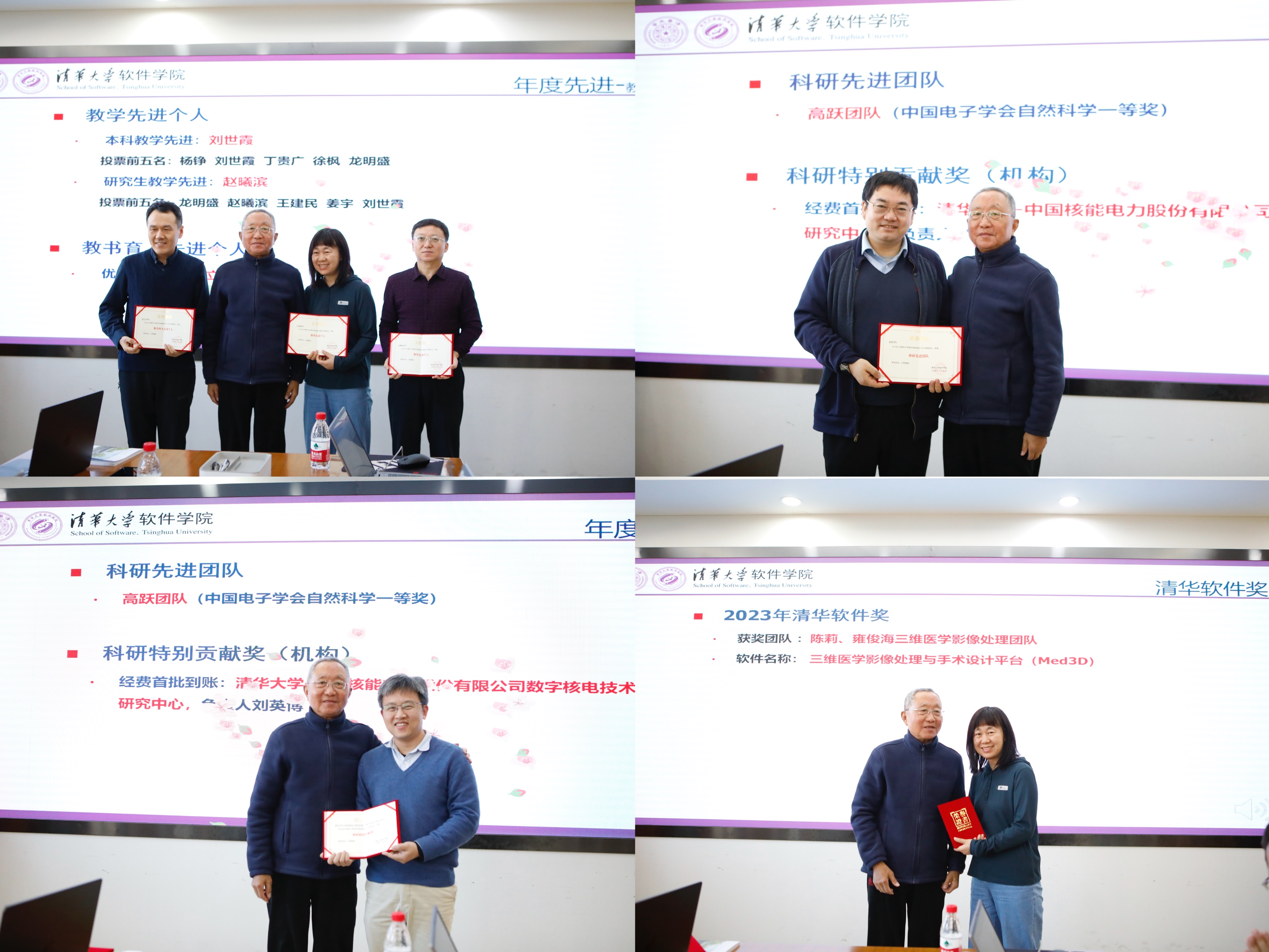 会上,孙家广院士为学院2023年度“教学先进个人”刘世霞教授和赵曦滨副教授、“教书育人先进个人”闻立杰副教授、“科研先进团队”高跃副教授团队、“科研特别贡献奖(机构)” 永利集团304am登录-中国核能电力股份有限公司数字核电技术联合研究中心主任刘英博副研究员等颁发获奖证书,为陈莉研究员、雍俊海教授三维医学影像处理团队颁发“2023年清华软件奖”。