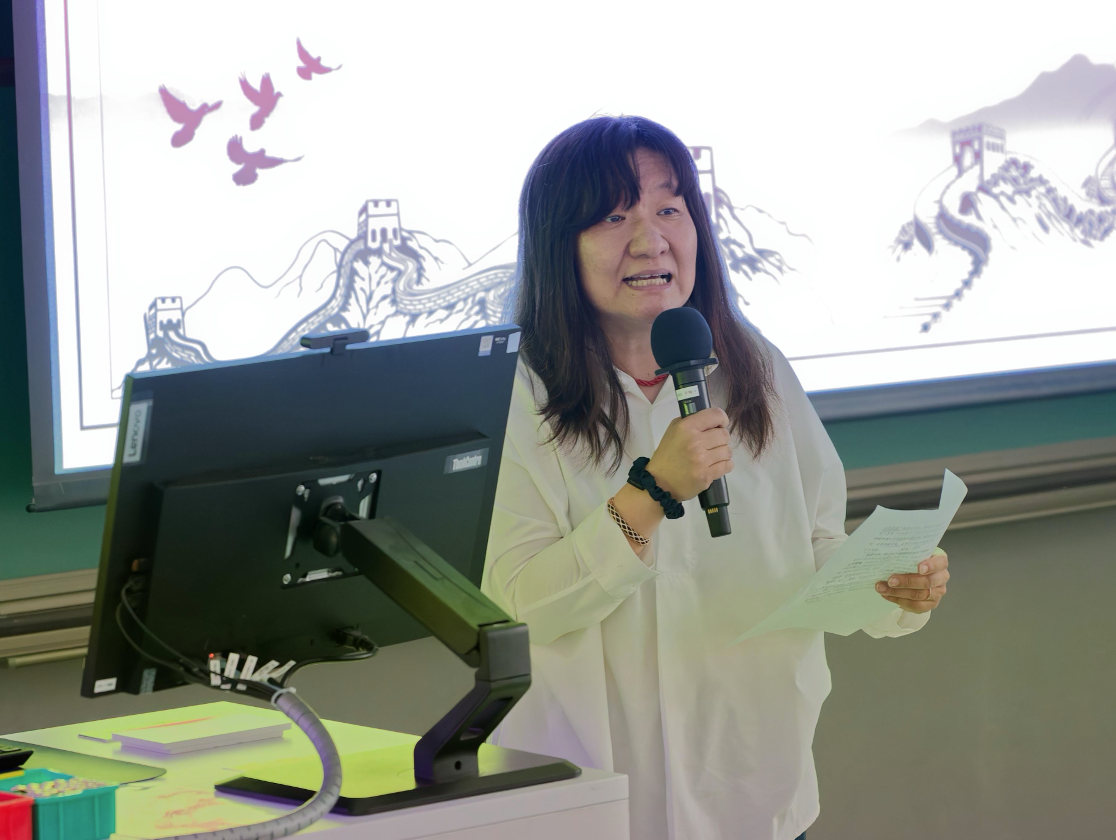 北京语言大学闻亭老师在讲话中介绍了北语“小联合国”的美誉,回顾了两校的历史渊源。她提到,此次共建活动是文理工科的深度交融。她在教师培养方面指出,优秀教师应具备对学生、事业和祖国的“三份爱”。以自己即将赴加拿大和南非的任务为例,她强调只有怀着对祖国执着之爱,才能传播中国语言文化。最后,闻老师希望同学们秉承“至少为祖国健康工作五十年”的精神,带着这份爱走向未来,推动中华文化的传承与传播。