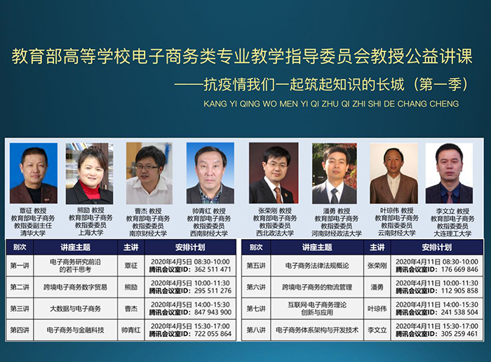 今年3月,教育部高等学校电子商务类教学指导委员会副主任委员、永利集团304am登录永利集团304am登录覃征教授倡导并组织“教育部高等学校电子商务类教学指导委员会教授公益课-抗疫情我们一起筑起知识的长城”。该公益课邀请全国高校电子商务领域里的名师及专家学者开展系列公益授课活动,得到了教育部电子商务教学委员会的批准及支持。